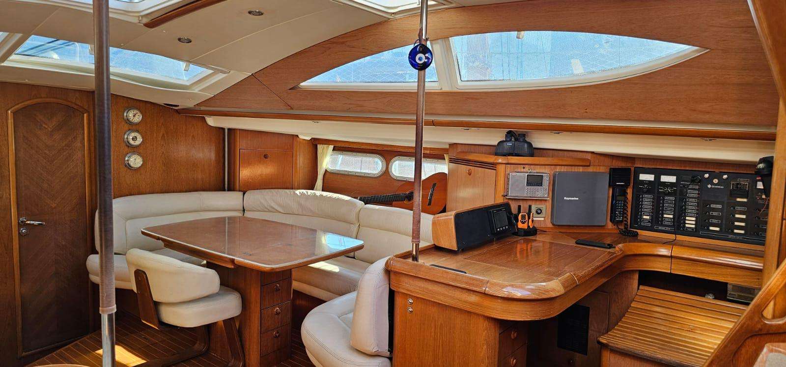 Her spacious cockpit comfortably seats 10 people around the large dining table, perfect for relaxing, socializing, or enjoying meals at anchor. The full teak deck is ideal for sunbathing during the day and stargazing on warm Aegean nights.