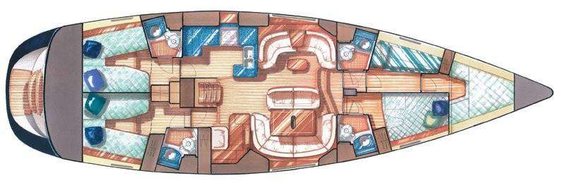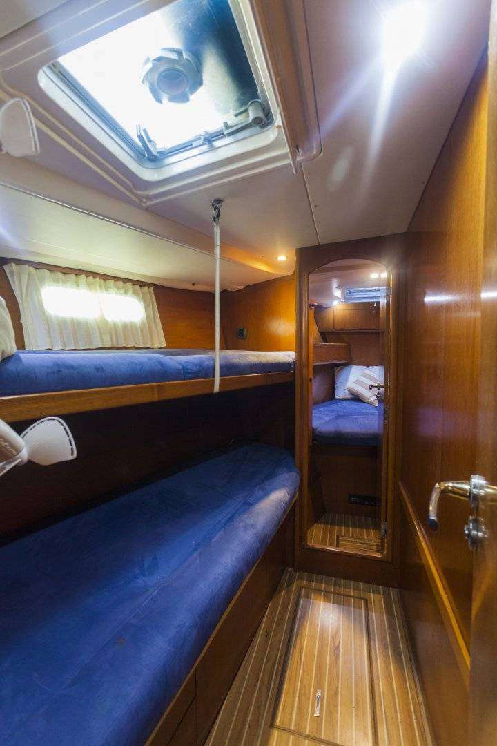 The Jeanneau 54 DS features two queen-size aft cabins, each with private en-suite bathrooms, ensuring comfort and privacy. Forward, you’ll find a double cabin with en-suite head to starboard, plus a double bunk cabin to port that shares a bathroom with the forward V-berth.